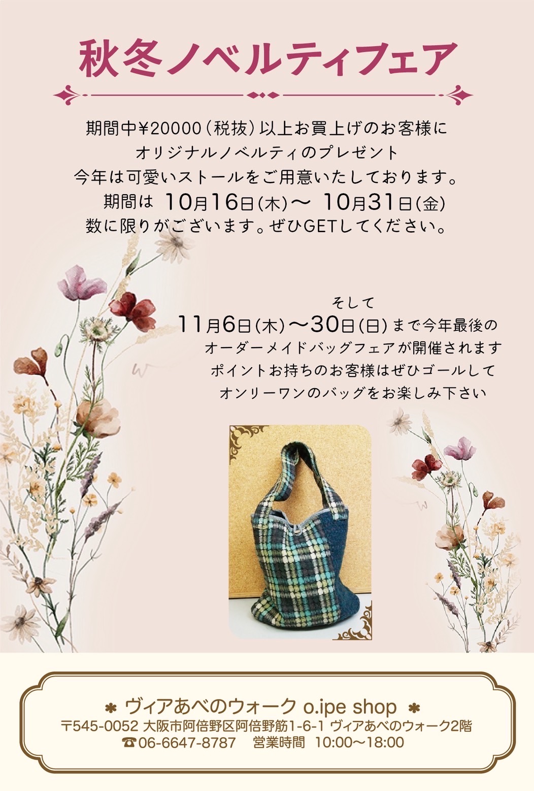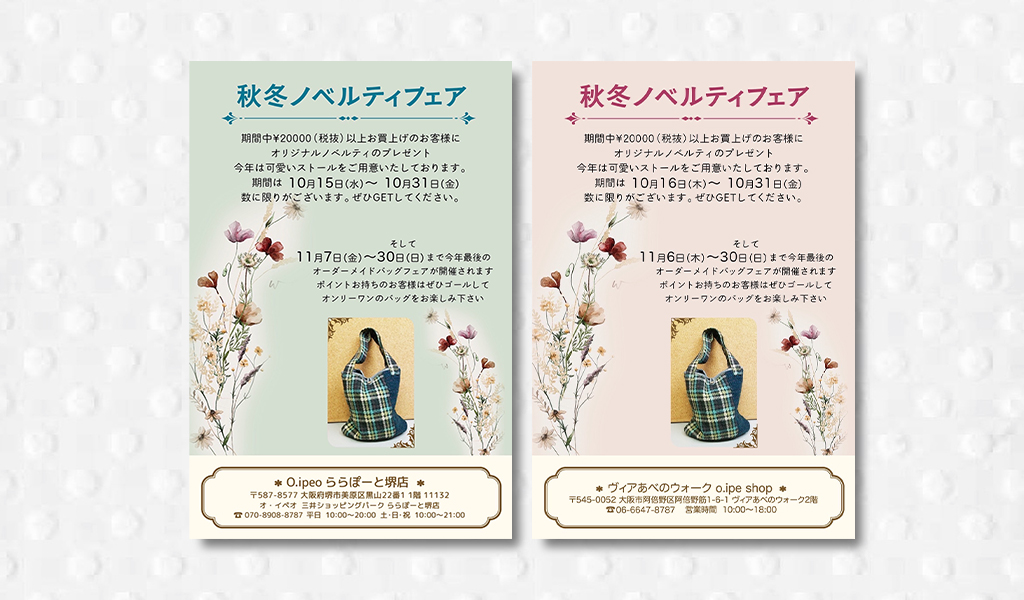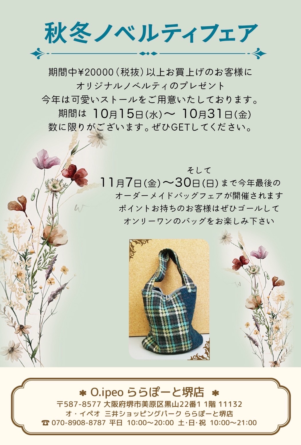 お知らせ 2025秋冬ノベルティフェア 10/15〜(ららぽーと堺)・16〜(ヴィアあべのウォーク) 期間中 ¥20,000(税抜)以上お買上げのお客様にオリジナルノベルティのプレゼント!今年は可愛いストールをご用意いたしております。【期間】★ららぽーと堺店10月15日(水)〜31日(金)★ヴィアあべのウォーク O.iPeO Shop10月16日(木)〜31日(金)数に限りがございます。ぜひGETしてくださいね。 そして今年最後のオーダーメイドバッグフェアが開催されますポイントをお持ちの方はぜひゴールしてオンリーワンのバッグをお楽しみください!【期間】★ららぽーと堺店11月7日(金)〜30日(日)★ヴィアあべのウォーク O.iPeO Shop11月6日(木)〜30日(日)