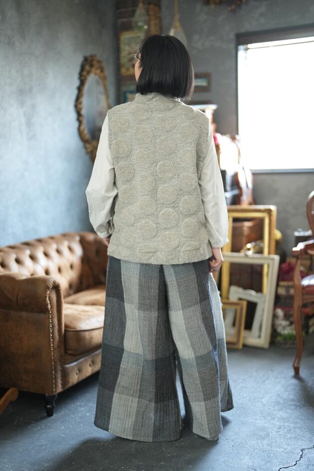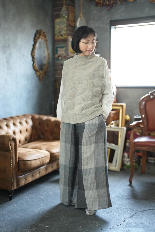 BERS, 商品一覧 2025 BERS オータム・ウインターコレクション 2 このコーディネートに使用のアイテムです。オイペオ商品は全て国内生産品になります。 7116-CN_レーシージャガードベスト_¥12,980(税込) 7000-AO_オーバーレースブラウス_¥15,180(税込) 7135-CN_ウールチェックフレアパンツ_¥27,500(税込) 商品のお問い合わせはこちら