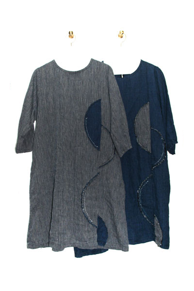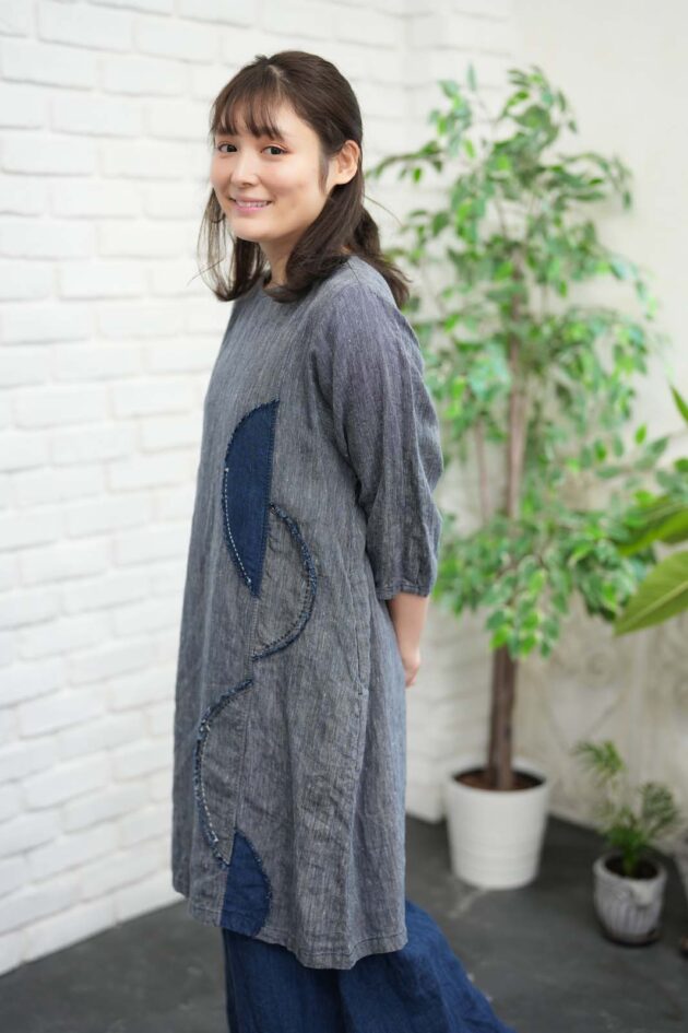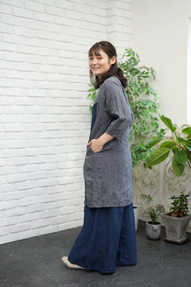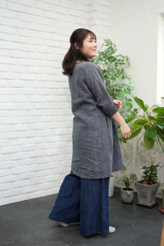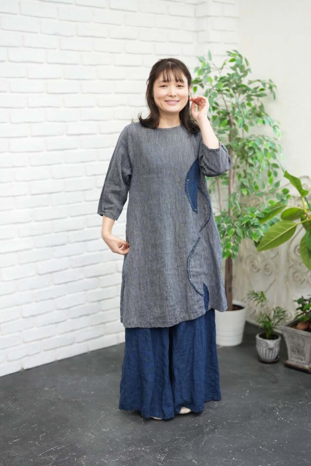 BERS, 商品一覧 2026 BERS スプリングコレクション07 このコーディネートに使用のアイテムです。オイペオ商品は全て国内生産品になります。 8115-AO_先染インディゴチュニックO.P(身丈95)(7分袖)_¥25,300(税込) 8116-AN_先染インディゴフレアパンツ_¥21,780(税込) 商品のお問い合わせはこちら
